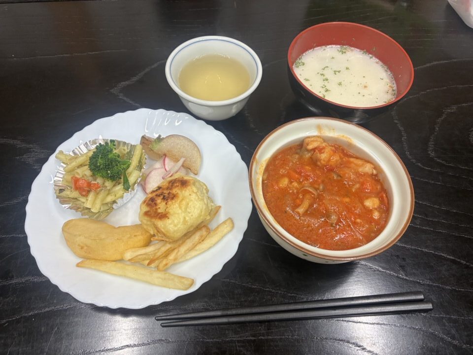 チキンのトマト煮込みや蕪のソテー、スコーン、玉ねぎのみそクリームスープ等豪華な食事を堪能しました。