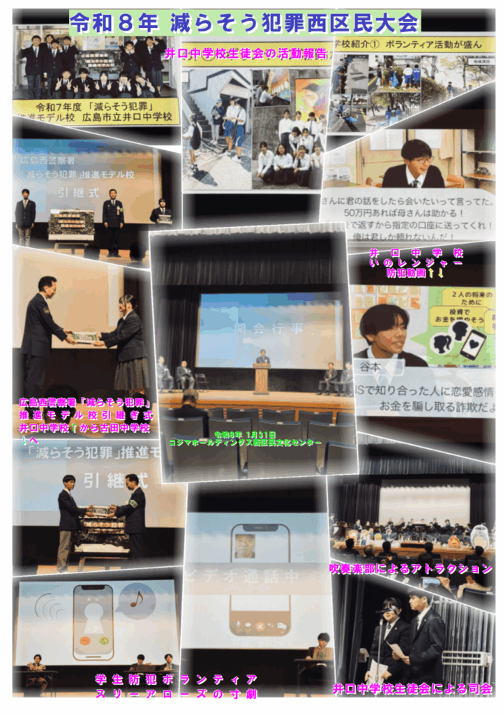広島市安全なまちづくり功労表彰・活動報告、令和7年度「減らそう犯罪」推進モデル校の広島市立井口中学校の生徒会活動報告・いのレンジャーの防犯動画披露、推進モデル校引継ぎ式(井口中学校から古田中学校へ)や基調講演、学生防犯ボランティア「スリーアローズ」による寸劇。最後は井口中学校吹奏楽部による演奏で締めくくりました。なお司会進行は井口中学校生徒会のお二人でした。